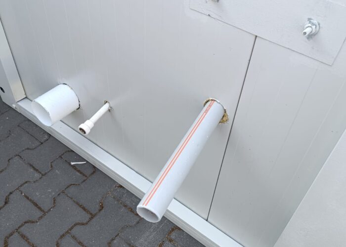 Kontenery wykonane są z płyt warstwowych o gr. 50mm wypełnionych pianą PUR, a konstrukcję tworzą profile stalowe, ocynkowane. Wszystko w technologii skręcanej.